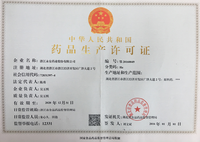 潛江永安藥業股份有限公司成立于2001年,坐落于江漢平原腹地潛江市國家高新技術產業開發區,占地500余畝,注冊資金貳億玖仟肆佰陸拾捌萬貳仟伍佰元整,是一家擁有自主知識產權的國家高新技術企業。公司股票于2010年3 月5日在深圳證券交易所掛牌上市(股票代碼為002365)。公司具有雄厚的技術開發能力,是湖北省創新型企業和湖北省知識產權建設示范企業。公司研發平臺分別被認定為省級企業技術中心和湖北省功能性食品添加劑工程技術研究中心。 經過多年的發展,公司形成了以食品及藥品添加劑?;?/p>